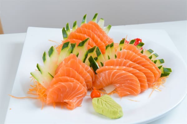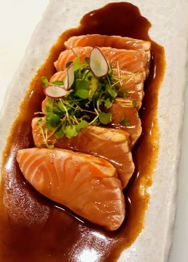 Lâminas de salmão e molho oriental.