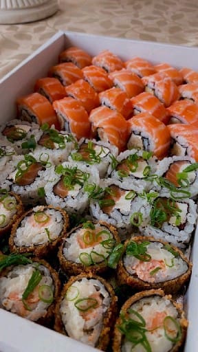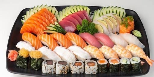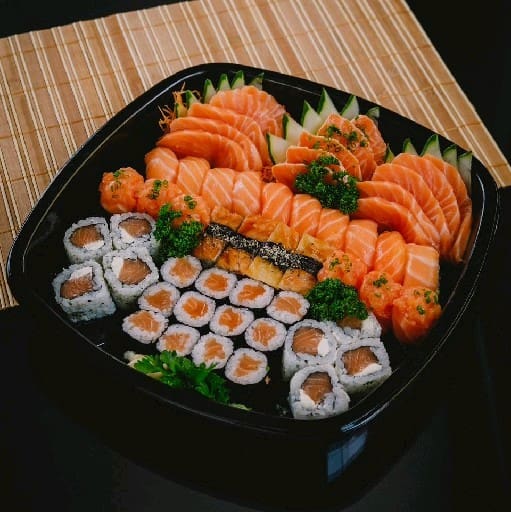 6 sashimis de salmão, 6 sashimis de atum , 6 sashimis de peixe branco , 5 niguiris de atum , 5 niguiris de salmão, 16 hossomakis variados , 12 uramakis .