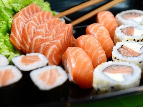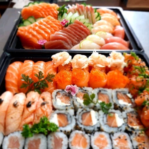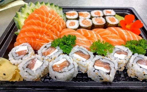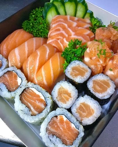 5 sashimi salmão, 5 sashimis atum , 3 niguiri de atum ,4 uramaki de salmão, 3 niguiri salmão , 4 jou salmão, 6 hossomakis atum /salmão.