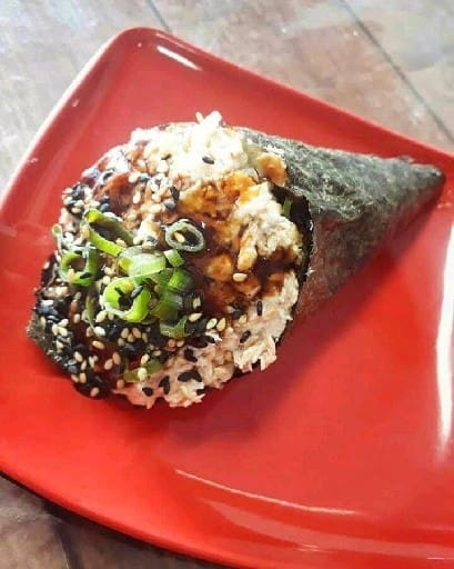 Temaki de salmão grelhado com cream cheese arroz alga marinha, salmão e cebolinha 180g
