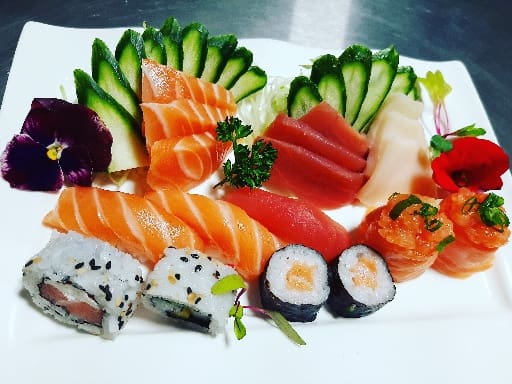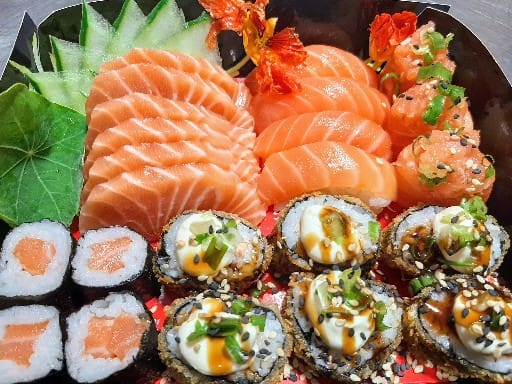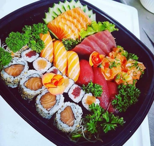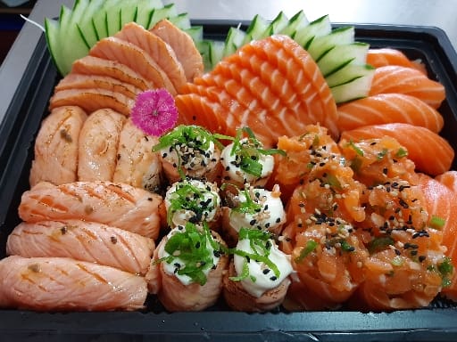 3 sashimi salmão ,3 sashimi atum ,3 sashimi branco 2 niguiri salmão, 1niguiri de atum , ,2 joe 2 salmomaki, 2 uramaki.