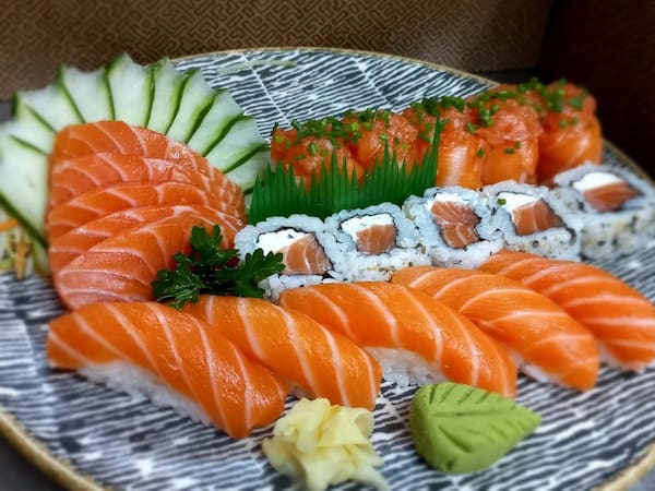 6 sashimi salmão 4 niguiri 2 joe 2 uramaki 4 salmomaki.