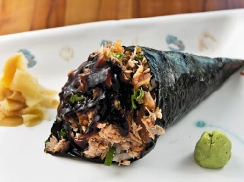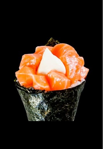 Temaki de salmão grelhado com cream cheese arroz alga marinha, salmão e cebolinha 180g