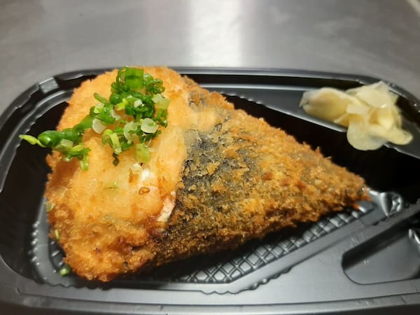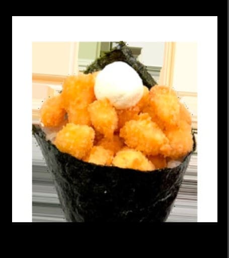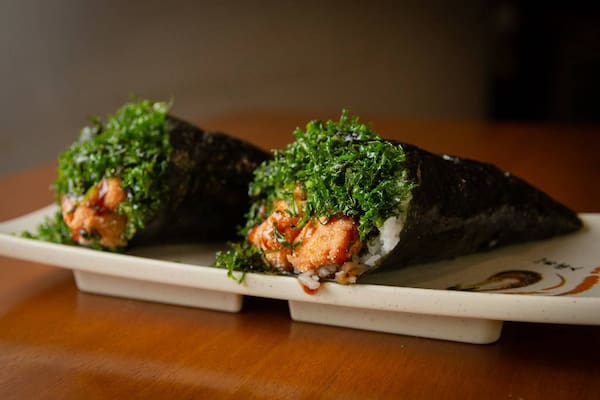 Salmão grelhado, arroz, alga marinha e cebolinha Temaki empanado e frito 180gr