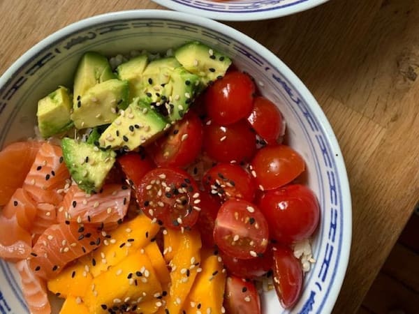Salmao , manga , abacate , tomate grape , base de shari , molho citrico e gergelim.
